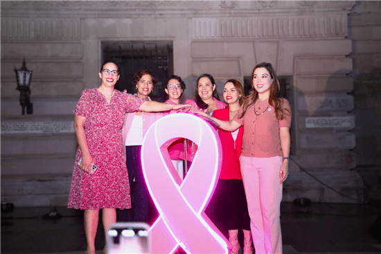 La jornada concluyó con la iluminación rosa de la Presidencia Municipal y de los edificios emblemáticos del primer cuadro de la ciudad, como símbolo de solidaridad y esperanza en la lucha contra el cáncer de mama.