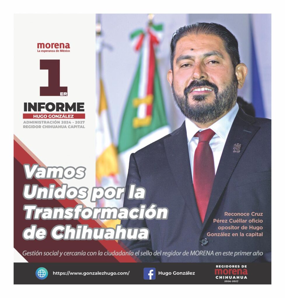 REGIDOR HUGO GONZÁLEZ PRESENTARÁ PRIMER INFORME. . . El regidor Hugo González se ha consolidado como una figura destacada dentro del movimiento Morena y en el Ayuntamiento de Chihuahua, gracias a su activa participación y liderazgo en diversas iniciativas ciudadanas. Su labor ha sido reconocida tanto por sus compañeros de partido como por la sociedad chihuahuense, quienes valoran su entrega y profesionalismo en el servicio público. . .