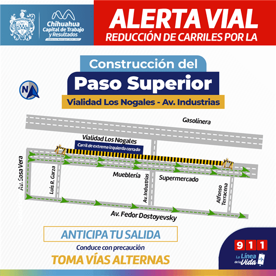 El Gobierno Municipal a través de la Dirección de Obras Públicas, emite un aviso preventivo vial por la reducción de tres a dos carriles en el cuerpo sur de la Vialidad Los Nogales, como parte de las actividades previas a la construcción del Puente Superior Vialidad Los Nogales.