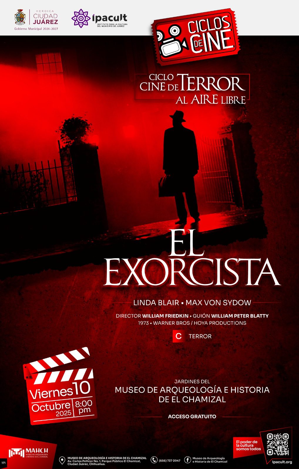 El Instituto para la Cultura del Municipio de Juárez (IPACULT) continúa acercando el séptimo arte a la comunidad con su programa “Ciclos de Cine”, que en esta ocasión presentará el icónico filme El Exorcista el próximo viernes 10 de octubre a las 8:00 de la noche, en el jardín del Museo de Arqueología e Historia de El Chamizal (MAHCH).