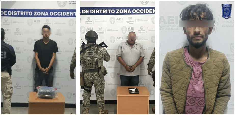 Elementos de la Agencia Estatal de Investigación, de la Guardia Nacional y de la Secretaria de la Defensa Nacional que realizan un operativo conjunto en el municipio de Cuauhtémoc, en las pasadas horas detuvieron en distintas intervenciones a tres masculinos por posesión de droga.