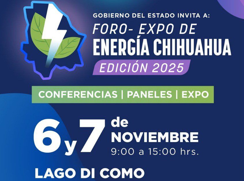 El Gobierno del Estado, a través de la Secretaría de Innovación y Desarrollo Económico (SIDE) invita al Foro-Expo de Energía Chihuahua 2025, a efectuarse el 6 y 7 de noviembre en el salón Lago Di Como de la capital, con entrada gratuita.