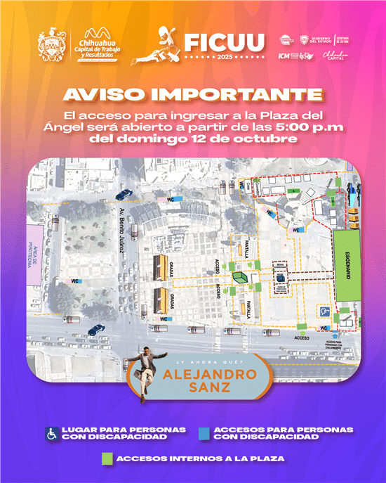 El Gobierno Municipal, informa los accesos para el concierto de Alejandro Sanz, así como las recomendaciones de seguridad para este evento del Festival Internacional Chihuahua (FICUU) edición 2025, que tendrá lugar el 12 de octubre a las 8:00 pm.