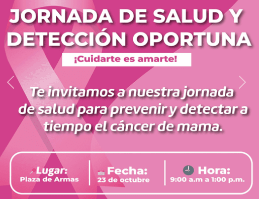 El Gobierno Municipal, invita a la próxima Jornada de Salud y Detección Temprana del cáncer de mama, este 23 de octubre en Plaza de Armas de 9:00 am a 1:00 pm, abierta al público en general sin cita previa.