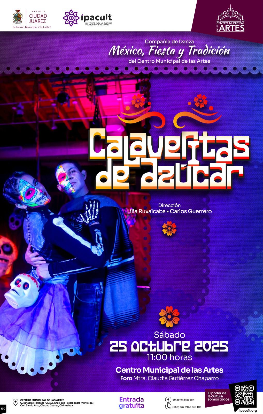 Ciudad Juárez.- El espíritu de las tradiciones mexicanas cobrará vida este sábado 25 de octubre en el foro Mtra. Claudia Gutiérrez Chaparro del Centro Municipal de las Artes (CMA), donde el Instituto para la Cultura del Municipio de Juárez (IPACULT) presentará de manera gratuita el espectáculo de danza “Calaveritas de Azúcar”. La función comenzará a las 11:00 de la mañana.