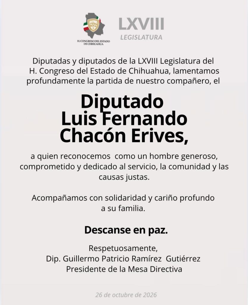 Diputadas y diputados de la LXVIII Legislatura del H. Congreso del Estado de Chihuahua, lamentamos profundamente la partida de nuestro compañero, el diputado Luis Fernando Chacón Erives, a quien reconocemos como un hombre generoso, comprometido y dedicado al servicio, la comunidad y las causas justas.