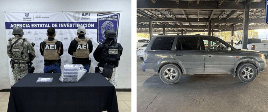 La droga estaba en el interior de una camioneta de la marca Honda Pilot, modelo 2008, color gris, con matrículas de circulación del estado de Chihuahua, el cual quedó asegurado para investigación.