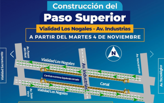 A partir del martes 4 de noviembre, el carril de extrema izquierda de la vialidad Los Nogales en el tramo que entre avenida Venceremos y la calle Ignacio Rodríguez será cerrado, sin embargo, la vía central y de extrema derecha estarán disponibles para la circulación.