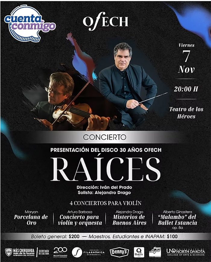 La secretaria de Cultura expresó “Nos sentimos muy entusiasmados porque un disco, un esfuerzo que tuvo bien grabarse el año pasado en el marco del Bicentenario del Estado… un homenaje a la sinfónica mexicana el disco lleva por nombre Raíces , tiene que ver con elementos de identidad con los que nos une a los chihuahuenses , me da gusto que este año lo puedan escuchar , nuevamente en el Teatro de los Héroes en punto de las 8 de la noche”.