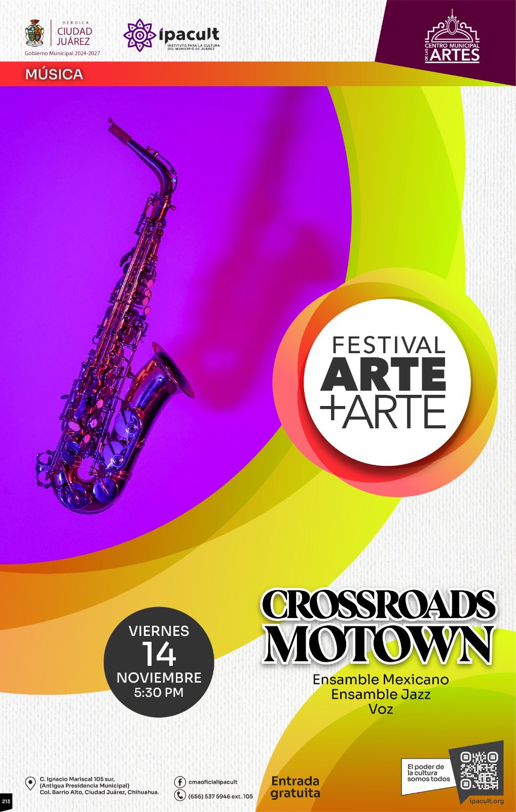 Ciudad Juárez.- El Instituto para la Cultura del Municipio de Juárez (IPACULT) invita a la ciudadanía al gran cierre del Festival Arte+Arte, que se llevará a cabo este viernes 14 de noviembre a partir de las 5:30 de la tarde en el foro Mtra. Claudia Gutiérrez Chaparro del Centro Municipal de las Artes (CMA), ubicado en la antigua presidencia municipal, detrás de la Catedral de Nuestra Señora de Guadalupe.
