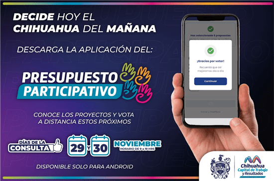 El Gobierno Municipal a través del a Coordinación de Participación Ciudadana, informó que ya se encuentra disponible la aplicación oficial para votar en el Presupuesto Participativo 2026, una herramienta digital que operará exclusivamente los días 29 y 30 de noviembre y que permitirá a la ciudadanía emitir su voto desde cualquier dispositivo Android.