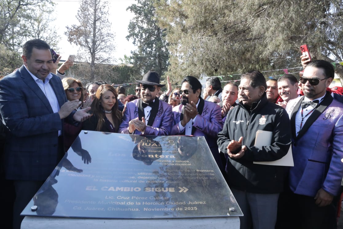 Ciudad Juáarez.- El Presidente Municipal, Cruz Pérez Cuéllar, encabezó la develación de la placa conmemorativa que otorga el nombre “Los Frontera” a un parque de la ciudad, como reconocimiento a la trayectoria de la agrupación juarense con más de cinco décadas de historia musical.