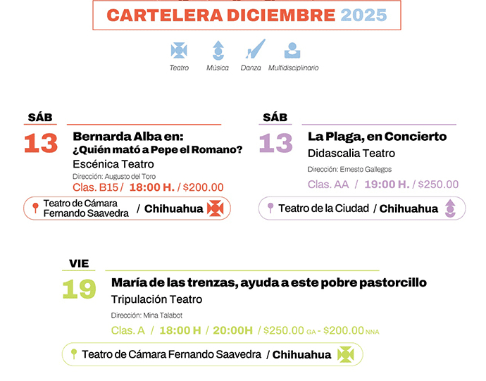 El sábado 13 de diciembre comienzan las actividades en la ciudad de Chihuahua, con la puesta en escena “Bernarda Alba en: ¿Quién mató a Pepe el Romano” de Escénica Teatro, con la dirección de Augusto del Toro, a las 18 horas, en el Teatro de Cámara “Fernando Saavedra”, con un costo de 200 pesos y dirigida a mayores de 15 años.