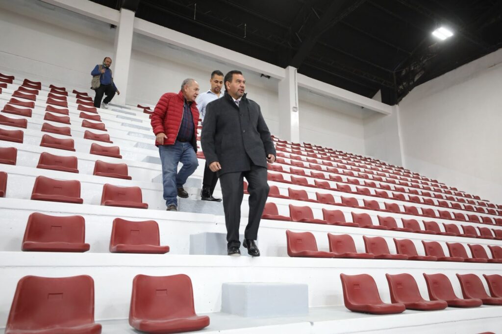 Durante el recorrido se destacó la renovación completa del sistema de iluminación, ahora totalmente LED, así como la instalación de nuevos graderíos y butacas generales, preferentes y VIP. Además, se modernizó la duela, se colocaron canastos de nivel profesional y se implementó un nuevo sistema de sonido.