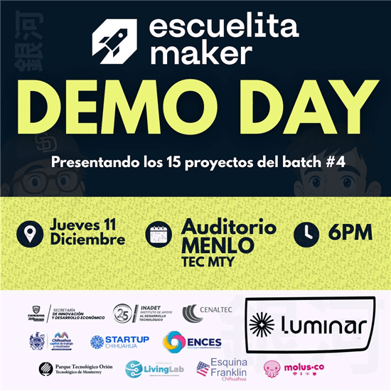 El Gobierno Municipal de Chihuahua invita a la comunidad emprendedora, académica y empresarial a asistir al Demo Day del Batch 4 de Escuelita Maker Luminar, que se realizará el 11 de diciembre de 2025, a las 6:00 pm, en el Auditorio Menlo PIT 2 del Tecnológico de Monterrey.