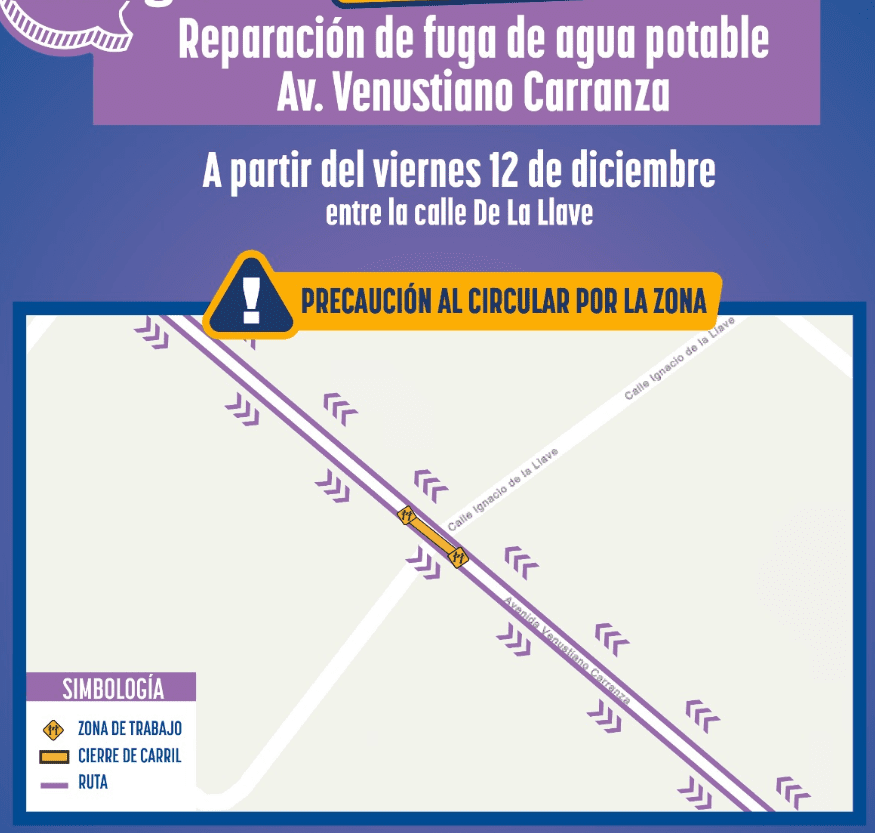 Debido a las maniobras de reparación que iniciarán a las 9 de la mañana, se cerrará parcialmente el carril de alta sobre la avenida Venustiano Carranza, por lo que se exhorta a los conductores a utilizar vías alternas para evitar posibles congestionamientos.