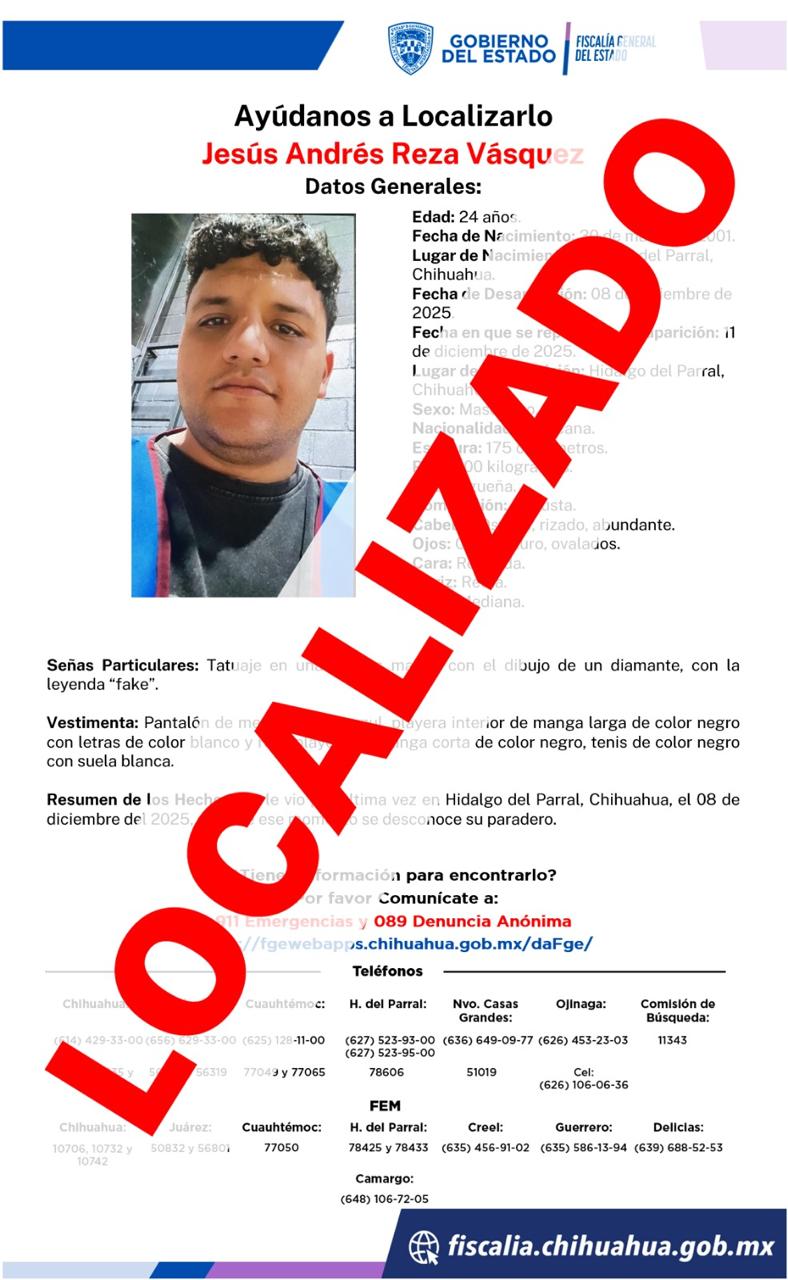 La efectiva y oportuna activación de los protocolos de búsqueda coordinados por la Fiscalía de Distrito Zona Sur, permitió localizar sano y salvo a Jesús Andrés R. V., de 24 años de edad, quien fue reportado como ausente ayer jueves en la ciudad de Parral.