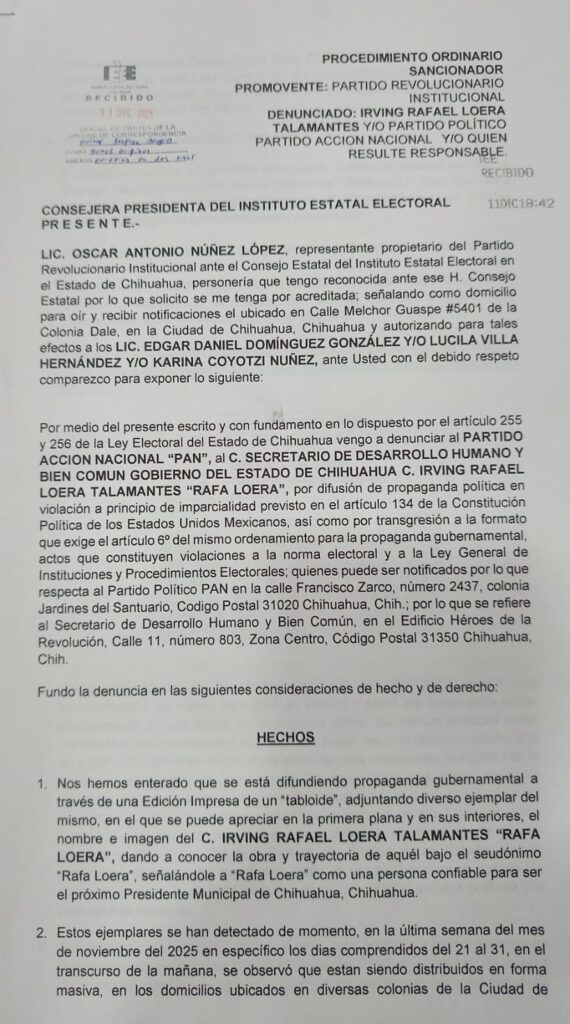 EL PRI DENUNCIA A RAFA LOERA DEL PAN. . . El Partido Revolucionario Institucional (PRI) en Chihuahua presentó una denuncia formal ante el Instituto Estatal Electoral (IEE) contra Rafael Loera Talamantes, actual secretario de Desarrollo Humano y Bien Común del Gobierno estatal. La queja se centra en la supuesta promoción anticipada de su imagen personal mediante propaganda política y el presunto uso de recursos públicos, acciones que, según el PRI, rompen con la equidad y legalidad exigidas en los procesos electorales. . .