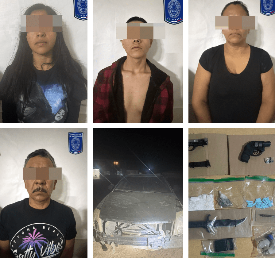Elementos de la Agencia Estatal de Investigación, adscritos a la Fiscalía de Distrito Zona Noroeste, detuvieron a, Neyba L. M., Daniel Efraín C. A., Yaneth L. L., y Alonso C. F., por portación ilegal de arma de fuego y delitos contra la salud.
