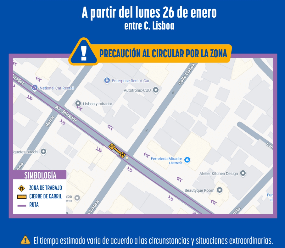 Derivado de estos trabajos, la circulación vehicular en sentido sur a norte de la avenida Mirador se verá parcialmente afectada, específicamente en el carril de alta velocidad, el cual permanecerá cerrado por un periodo aproximado de 15 días, tiempo necesario para permitir el fraguado adecuado del concreto.