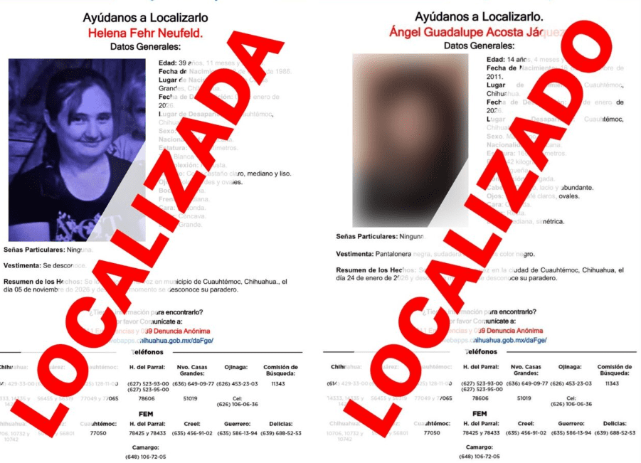 También, en la ciudad de Chihuahua localizaron a Helena F. N., de 40 años de edad, integrante de la comunidad menonita, reportada ausente desde el 09 de enero de 2026.