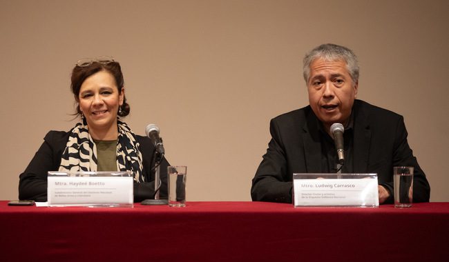 México, CDMX, 04/02/2026. Sala Adamo Boari. PBA. Presentación programación 2026 de la OSN. Con la presencia en podio de Mtra. Haydeé Boetto, Subdirectora General del Instituto Nacional de Bellas Artes y Literatura Y el Mtro. Ludwig Carrasco, Director titular y artístico de la Orquesta Sinfónica Nacional. Con la presencia en público de los compositores la Mtra Marcela Rodríguez y el Mtro Eduardo Angulo y con la presencia de la emabajada australiana con Benjamin Krieg, Segundo Secretario y Ana Sofía Salas, Oficial de Diplomacia Publica. Foto: Abraham Goldsmit K / Secretaría de Cultura.