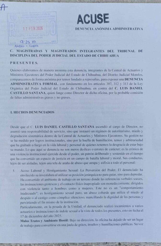 ¿HASTA CUÁNDO LA IMPUNIDAD EN LA CENTRAL DE ACTUARIOS?. . . En medio de una crisis institucional, el jefe de la Central de Actuarios del Poder Judicial del Estado de Chihuahua enfrenta una grave denuncia por presuntos actos de hostigamiento laboral y sexual, tratos humillantes, amenazas y favoritismo. El caso ha sacudido a la comunidad judicial y pone en evidencia las fisuras existentes en la administración de justicia, donde el abuso de autoridad parece haberse normalizado. . .