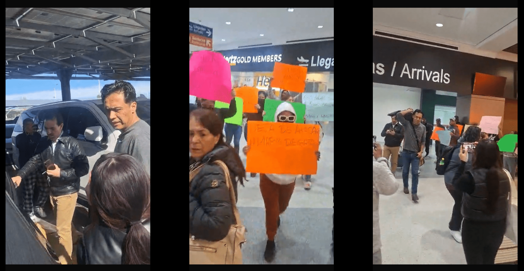 Los inconformes portaban cartulinas con mensajes críticos y se concentraron en el área de llegadas del aeropuerto, donde se generó un ambiente de tensión momentánea. No se reportaron incidentes mayores ni altercados físicos, aunque los reclamos se mantuvieron durante varios minutos.