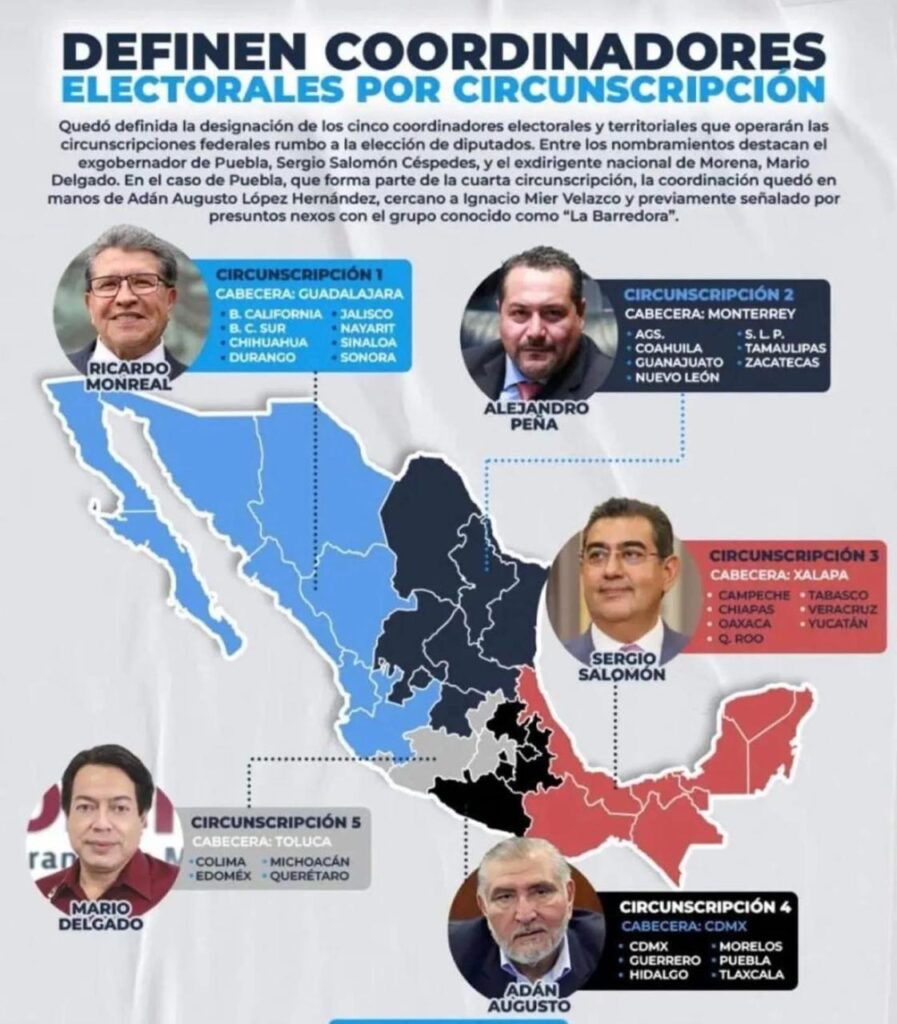 En medio de la carrera por la elección intermedia, los nombres que circularon extraoficialmente ya son el secreto peor guardado: Ricardo Monreal Ávila encabezará la región norte (Baja California, Baja California Sur, Chihuahua, Durango, Jalisco, Nayarit, Sinaloa y Sonora); Alejandro Peña Villa tomará el control del Bajío y noreste (Aguascalientes, Coahuila, Guanajuato, Nuevo León, Querétaro, San Luis Potosí, Tamaulipas y Zacatecas); Sergio Salomón Céspedes será responsable del sur y sureste (Campeche, Chiapas, Oaxaca, Quintana Roo, Tabasco, Veracruz y Yucatán); Adán Augusto López operará el centro y la capital (Guerrero, Morelos, Puebla, Tlaxcala y Ciudad de México); y Mario Delgado coordinará el occidente y centro (Colima, Hidalgo, Michoacán y Estado de México). . .