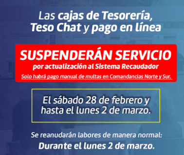 Asimismo, las cajas de Sexta y Mina que abren los sábados no contarán con atención al público, a excepción de las cajas receptoras que se ubican en las Comandancias Norte y Sur que brindarán atención manual para el pago de multas de dichos espacios.
