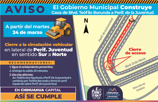 Con el objetivo de continuar mejorando la movilidad en Chihuahua Capital, el Gobierno Municipal, a través de la Dirección de Obras Públicas, recuerda a la ciudadanía que se realizará el cierre temporal de la lateral intermedia del periférico de la Juventud, en sentido del boulevard Ortiz Mena hacia el norte, debido a los trabajos de construcción de la Gaza de Incorporación entre avenida Teófilo Borunda y periférico de la Juventud.
