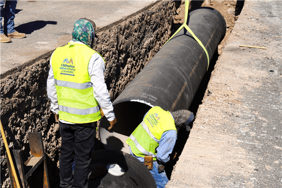 Con el apoyo de maquinaria pesada y personal especializado, se realizan labores de excavación e instalación de tubería de 36 pulgadas, la cual se caracteriza por su mayor durabilidad y resistencia; estos trabajos permitirán garantizar la continuidad de los servicios básicos para la ciudadanía.
