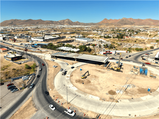 Como parte del plan estratégico de construcción, las cuadrillas de trabajo atienden diversos frentes de obra en las rampas de acceso, donde se realizan labores como el colado de parapeto, el tendido de base en el camellón del lado Chihuahua, además de la construcción de la caja captadora de agua pluvial, así como trabajos de colado en la glorieta, incluyendo la formación de guarniciones y banquetas.