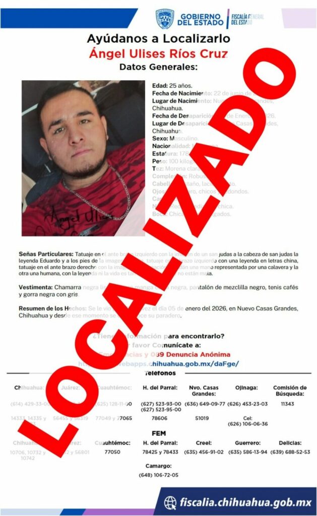 El adulto identificado como Ángel Ulises R. C., había desaparecido el 05 de enero de 2026, en Nuevo Casas Grandes, por lo que sus familiares interpusieron el reporte correspondiente ante esta representación social.