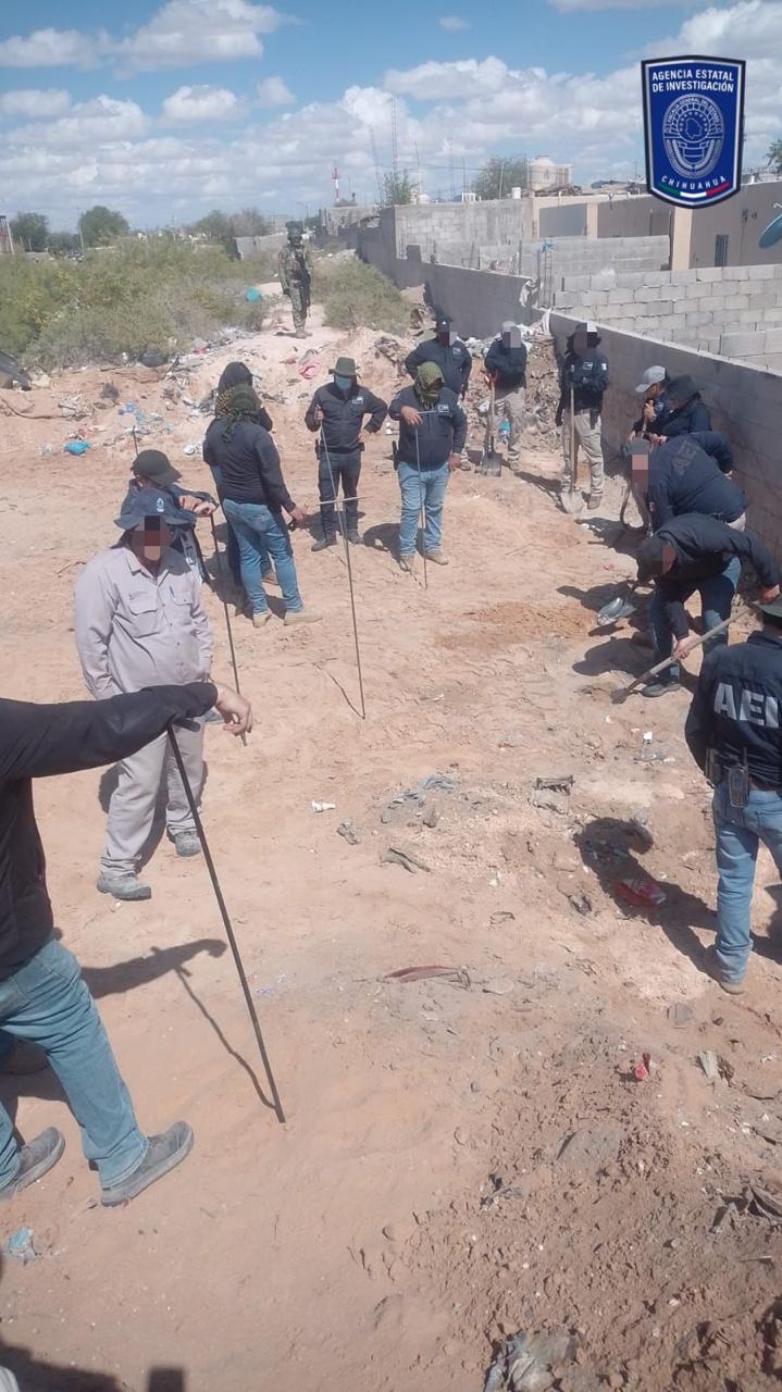 La intervención tuvo lugar esta mañana, en donde se recorrió y se inspeccionó de manera pedestre la zona desértica, de manera lineal y por cuadrantes, realizando sondeos con la barra metálica y realizando 120 pozos de sondeo sobre la superficie arenosa, además de que, con apoyo de una máquina retroexcavadora de la Junta Municipal de Agua y Saneamiento de Ciudad Juárez, se retiró minuciosamente la tierra en diversos puntos.
