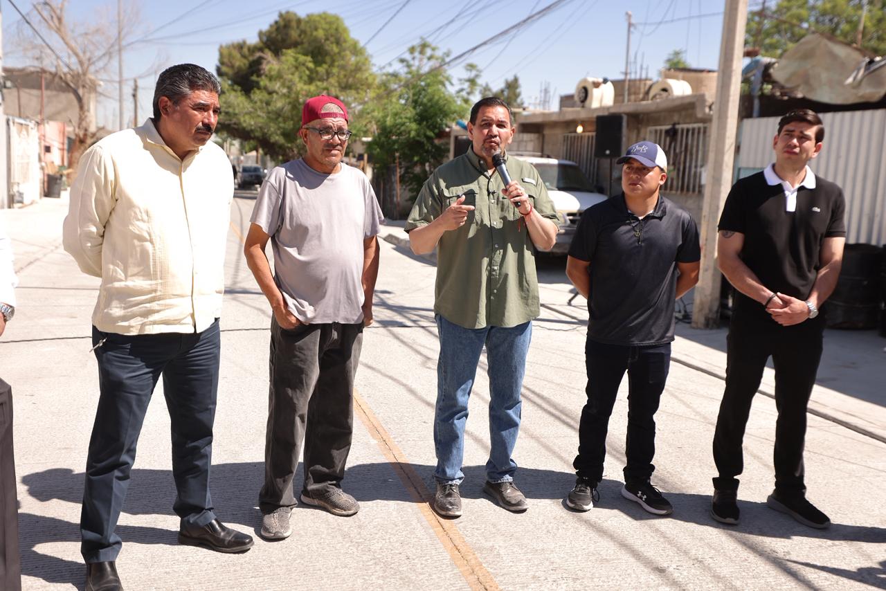 Ciudad Juárez.- El Presidente Municipal, Cruz Pérez Cuéllar, encabezó este día la entrega de la pavimentación de la calle Irving Flores, obra realizada a través del esquema de Presupuesto Participativo y que beneficiará directamente a residentes del sector.