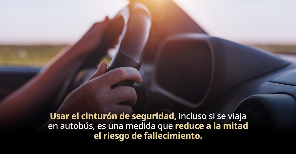 Al conducir un vehículo, se recomienda descansar bien antes de hacer el viaje y usar el cinturón de seguridad incluso si se viaja en autobús, ya que esta medida reduce a la mitad el riesgo de fallecimiento y la gravedad de las lesiones en caso de algún accidente.
